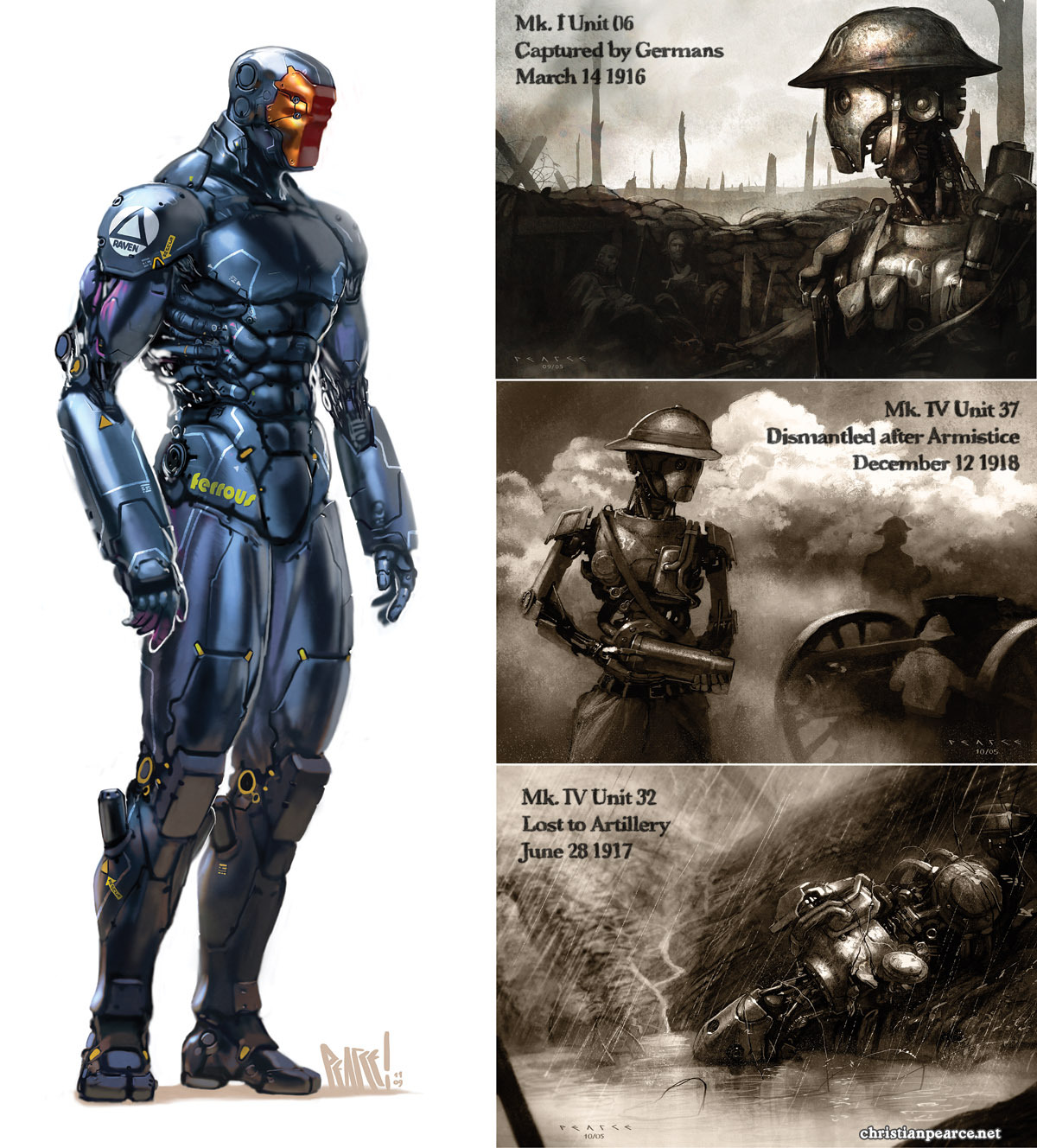 I’ve followed Christian’s work with interest over the years – ok, more like obsessively digitally stalked him over the internet (You too can join the fun! http://christianpearce.blogspot.co.nz/), which brings us (“Finally” you cry!) to the nexus. Given that this review is supposed to be about Royden Lepp’s fantabulously great comic book ‘Rust’, why am I going on about the equally fantabulously great (but apparently unrelated) Christian Pearce? Well, here it is: Christian has done a ton ‘o cool pictures over the years (including the cover of the latest issue of Faction – on MK1 shelves right now)but there was a series of them that featured robots in a WW1 setting that I have always loved in particular (http://payload16.cargocollective.com/1/5/190566/2629381/WW1Bot3PEARCE_1200.jpg). They’re images I’ve come back to many times and always wanted to know more about the parallel world that they inhabit. To my sequential art obsessed brain they have always looked like panels lifted from a comic and I’ve instinctively reached for the ‘before’ and ‘after’ panels that would give me the story behind them.